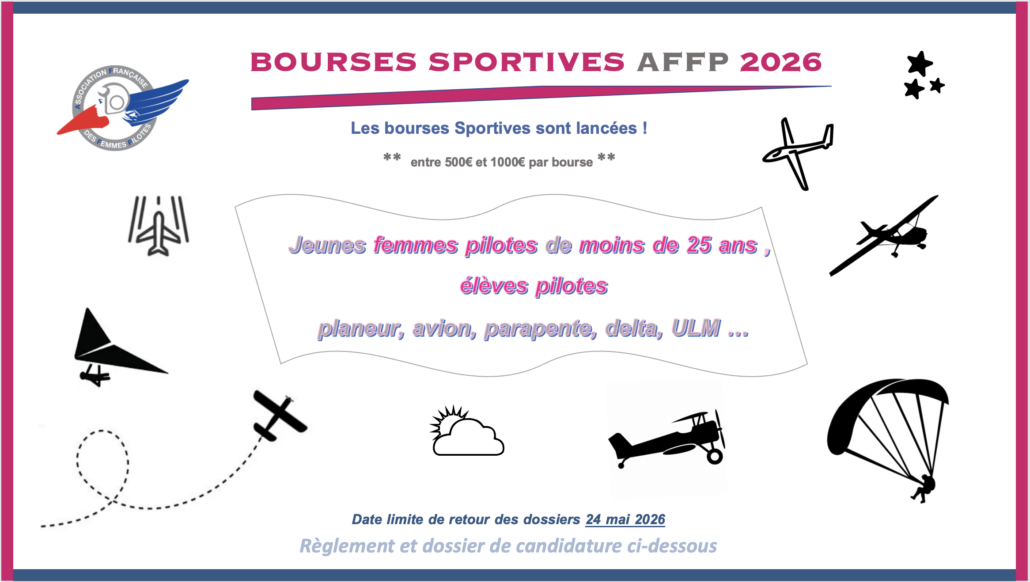 L’Association Française des Femmes Pilotes regroupe des femmes pilotes privées ou professionnelles et femmes de l’Air, partageant une même passion de voler, ainsi que les membres bienfaiteur.e.s qui les soutiennent ! Cette passion peut se décliner dans toutes les activités existantes dans les 9 fédérations de sports aériens françaises : ULM, planeur, avion, parachutisme, vol libre, hélicoptère, aérostation, aéromodélisme, construction amateur d’aéronefs ainsi que les drones. Depuis 2013 , l’AFFP renforce ses soutiens financiers, humains et matériels auprès des femmes pilotes, ainsi que des actions pédagogiques dans les écoles et auprès du grand public, notamment pour mettre en valeur le rôle des femmes dans l’histoire de l’aviation.
