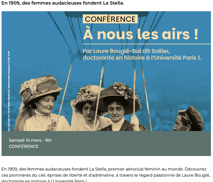 Venez assister à cette conférence sur la première association française de femmes pilotes "La Stella" , l'époque de leurs combats pour voler et faire du sport...